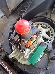Beim Öffnen des Gerätes erstaunte mich der winzige Motor (Bild 2, Feuerzeug zum Größenvergleich), dass der 1200 Watt ziehen soll, ist schon beeindruckend… Da war mir auch klar, warum die Drehzahl des Mähers bei etwas höher gewachsenem Gras sofort in die Knie geht. Also immer schön regelmäßig mähen :-).