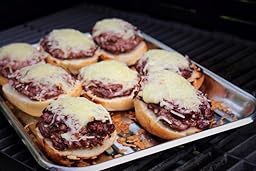 Brötchen halbieren und mit einer Mischung aus 400 Gramm gutem Hackfleisch, Zwiebeln, Salz & Pfeffer belegen. Dann mit der Fleischseite nach unten auf den Grill legen und knusprig braun grillen. Die Hälften umdrehen und am besten auf ein Blech legen.