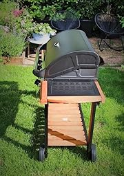 - Stabiles Stahlrohrdesign. Transportrollen. 2 Ablageflächen. Thermometer im Deckel. Flammbleche und Fettwanne.