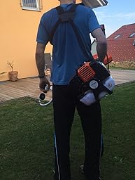 Um die Sicherheit zu gewährleisten wird die Motorsense mit einem Komfort-Tragegurt am Körper getragen, da das Gewicht auf Dauer doch etwas mehr wird und so kann es auch nicht so leicht aus der Hand rutschen. Auch die Schneidefläche ist auf der Innenseite (die zu den Füßen gerichtet ist) mit einer Metallabdeckung abgesichert. Ansonsten ist man selbst für die Sicherheit verantwortlich, wie man mit der Motorsense rumhantiert.